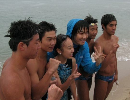 | キム・ジャンフン(右側三番目)が韓国体育大学スイミング部学生たちと一緒にぱっと笑っている./公演世の中提供 |