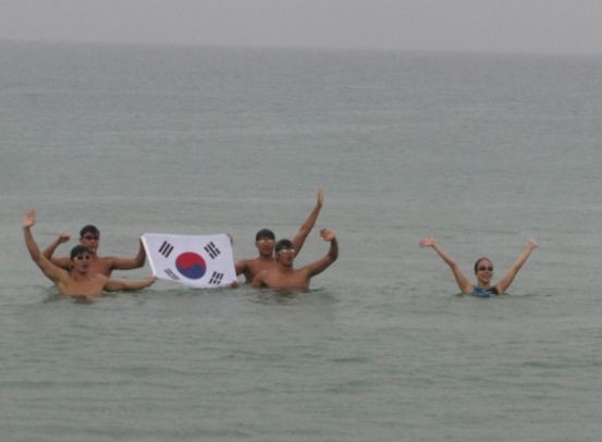 | 韓国体育大学スイミング部学生たちが蔚珍港沖合で太極旗をあげて独島横断の成功を祈っている. /公演世の中提供 |