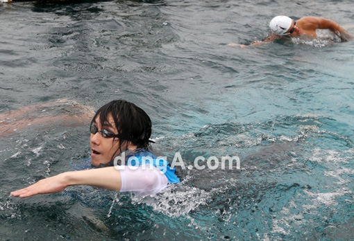 | 8.15 光復節を控えて 13日午前慶北蔚珍ズックビョンハングで独島スイミングプロジェクト出征式が開かれた. 歌手キム・ジャンフンが韓国体育大学スイミング選手たちを励ましている. 蔚珍|国境院記者 onecut@donga.com |