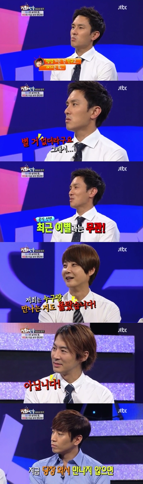 またドンワンは "別離の痛みを神話メンバーたちに乗り越えた"と説明したしここに前進彗星など神話メンバーたちは "絶対ない. キム・ドンワン誰会うかも知れなかった"とかっとなった.(写真=JTBC '神話放送' キャプチャ)